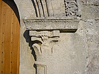 Portail roman : une archivolte à entrelacs et palmettes entoure une voussure. Deux colonnes à chapiteaux ornés de feuilles d'eau et de tailloirs à palmettes reçoivent l'arc en plein cintre.